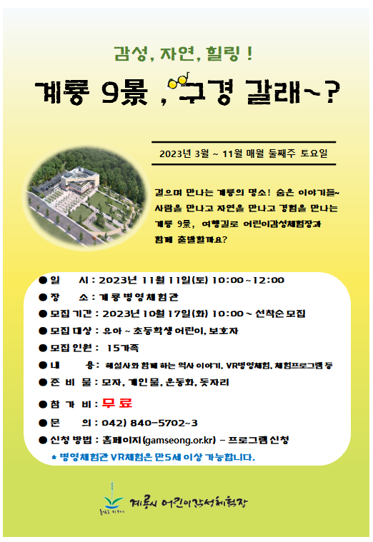 | ´ÙÀ½±Û | 11¿ù üÇè³îÀÌ(½£¼Ó³îÀÌÅÍ, °¨¼º³îÀÌ)ÇÁ·Î±×·¥ ¹× Àç¹ÌÁø ³îÀÌÅÍ »çÀü¿¹¾à¾È³» | ||||