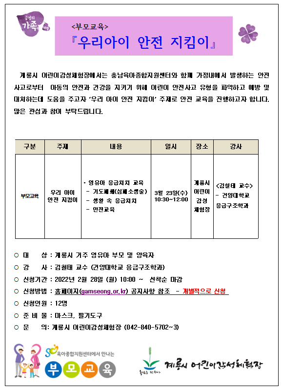 | ºÎ¸ð±³À° (¿ì¸®¾ÆÀÌ ¾ÈÀü ÁöÅ´ÀÌ - ¿µÀ¯¾ÆÀÀ±Þóġ) ¾È³» | |||||
