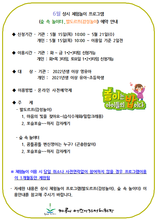 | 6¿ù »ó½ÃüÇè³îÀÌ(½£¼Ó³îÀÌÅÍ, °¨¼º³îÀÌ)ÇÁ·Î±×·¥ ¹× Àç¹ÌÁø ³îÀÌÅÍ »çÀü¿¹¾à¾È³» | |||||
