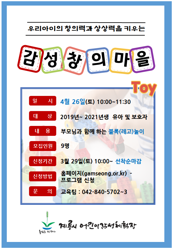 | Àå¼Ò | °è·æ½Ã ¾î¸°À̰¨¼ºÃ¼ÇèÀå ÇÁ·Î±×·¥½Ç | ||