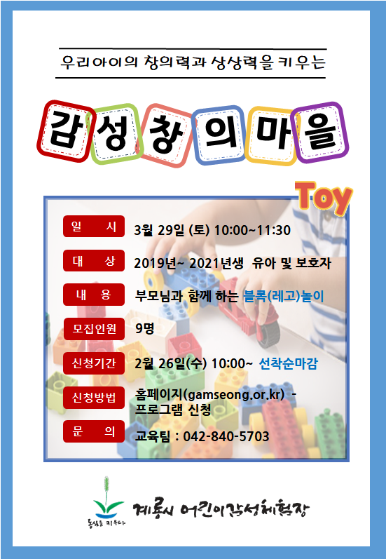 | Àå¼Ò | °è·æ½Ã ¾î¸°À̰¨¼ºÃ¼ÇèÀå ÇÁ·Î±×·¥½Ç | ||