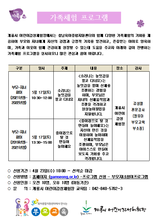 | 5¿ù °¡Á·Ã¼Çè ÇÁ·Î±×·¥ »çÀü¿¹¾à½Åû ¾È³»(¿ÀÈÄ) | |||